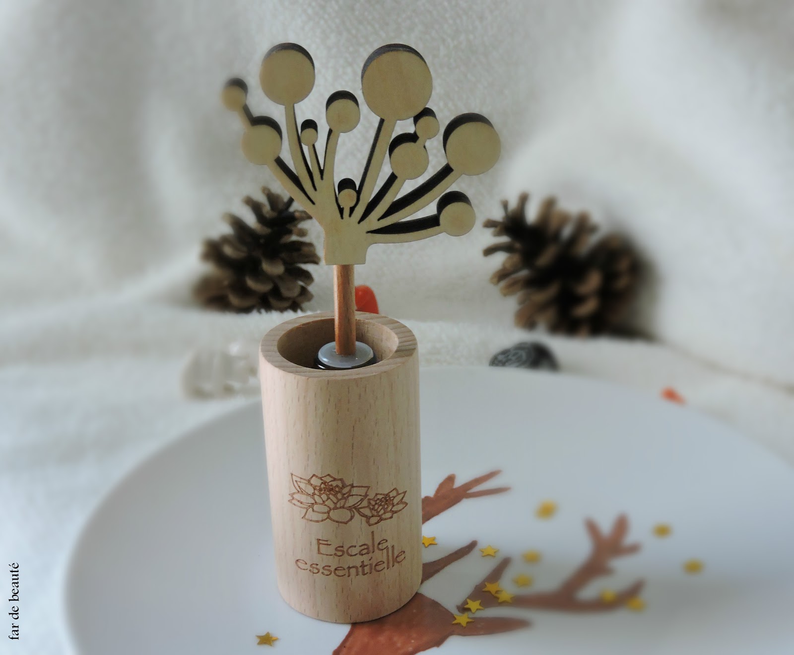Mon diffuseur par capillarité (Nature et Découvertes), pour une diffusion naturelle d'huile essentielle. Un pot en bois de hêtre tout mignon pour y glisser un flacon d'huile essentielle de 15ml. J'ai choisi l'huile essentielle d'eucalyptus staigeriana (Aroma-Zone), calmante, apaisante et idéal également pour purifier l'air.